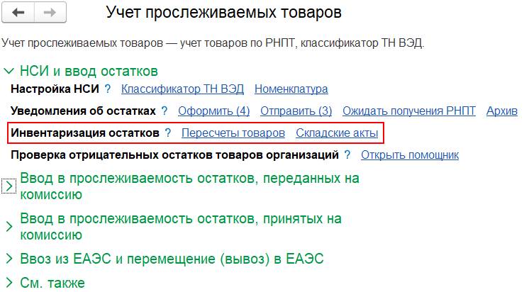 Все действия по учету прослеживаемых товаров можно выполнять в рамках единого рабочего места Учет прослеживаемых товаров, которое доступно по ссылкам: