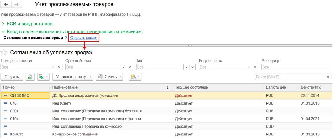 Просмотреть список соглашений, по которым предусмотрена передача на комиссию, можно гиперссылке Открыть список. Список соглашений открывается с отбором по хозяйственной операции Передача на комиссию.