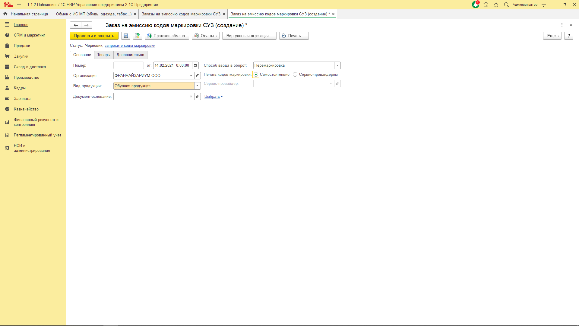 В зависимости от вида выбранного сервис-провайдера в документе Заказ кодов маркировки СУЗ ограничивается выбор способа ввода в оборот и вида продукции.