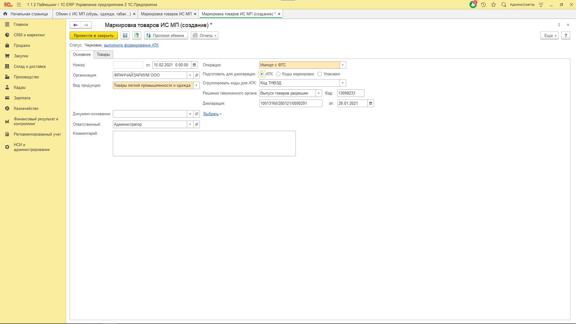 Коды АТК, как правило, применяется, если список импортируемых кодов маркировки превышает допустимое количество кодов в декларации. Для формирования этих кодов на форме документа выводится ссылка выполните формирование АТК.