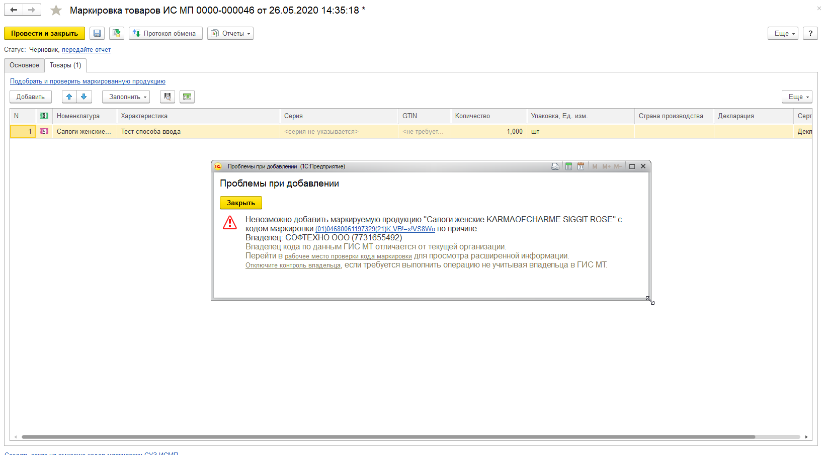 Проверка кодов маркировки в процессе оформления операции при добавлении товаров в документ выполняется при условии, что включена проверка кодов. В случае если текущий статус или владелец не соответствуют выполняемой операции, то при добавлении такого кода выводится сообщение с описанием проблемы.