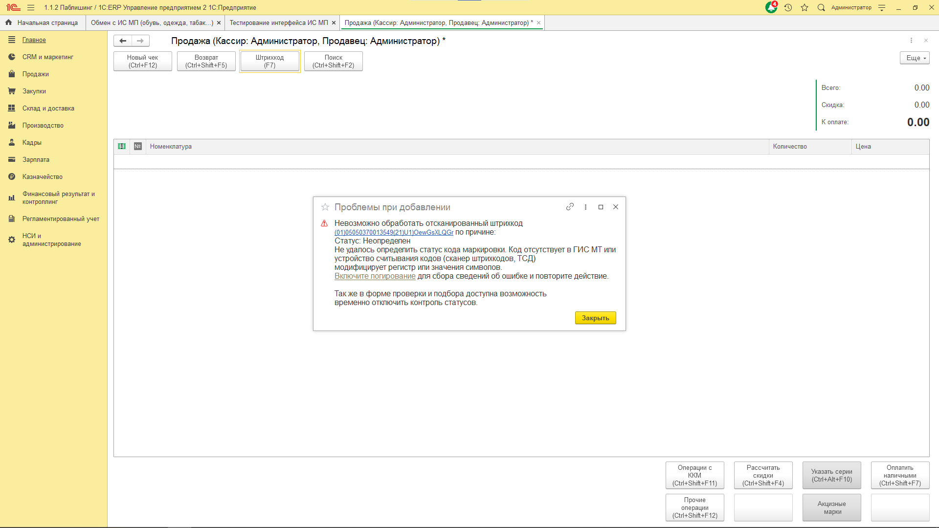 В окне сообщения доступны ссылки, по которым можно перейти в рабочее место Проверка кодов маркировки, а также к панели администрирования для отключения контроля статусов.