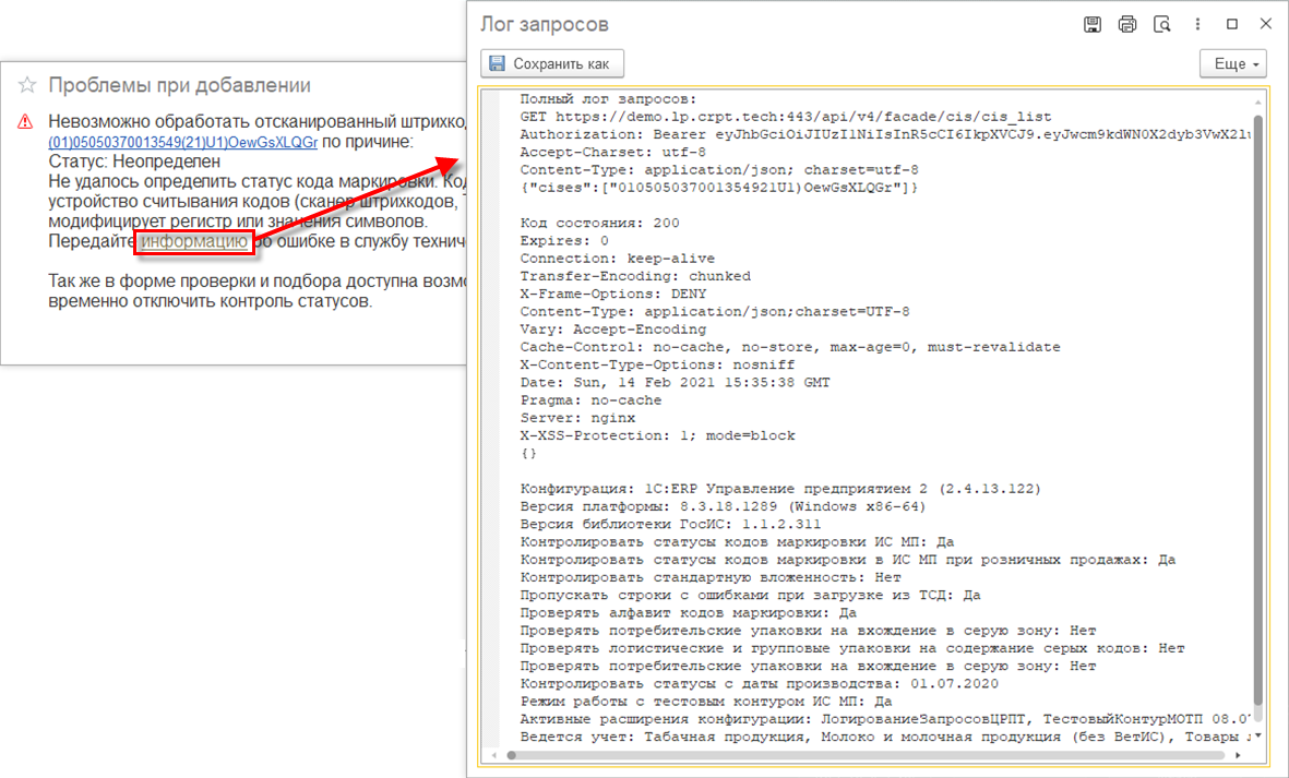 Например, пользователь считывает код маркировки и получает в ответ сообщение со статусом Неопределен. Эта ситуация является исключительной и требует обращения к техническому специалисту обслуживающей организации или в службу поддержки. Поэтому предлагается включить логирование для сбора сведений об ошибке.