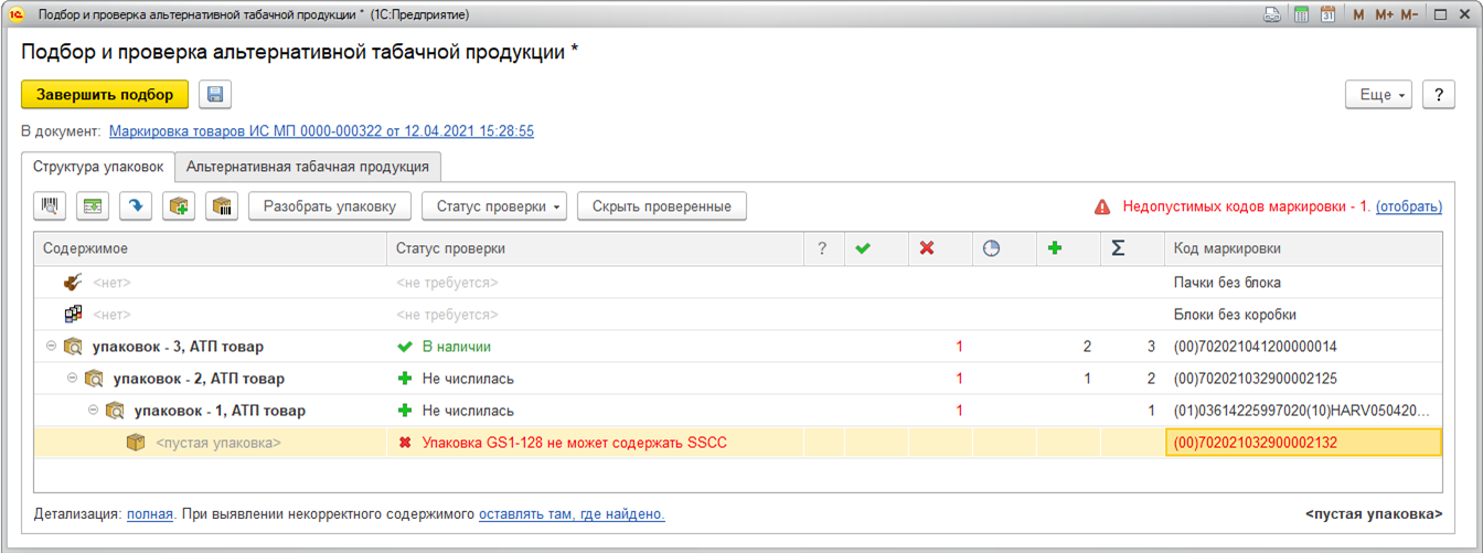 Для АТП добавлен новый контроль: в блоке могут содержаться коды потребительских упаковок только одного шаблона (GS1 или «Классический табак»). В документе Маркировка товаров ИС МП с видом операции Агрегация для Табачной продукции предусмотрен флаг Проверить состав упаковок по данным ИС МП. Если найдены расхождения в составах (коды, отсутствующие в новой агрегации), то выводится сообщение об ошибке в нижней части формы и информация сохраняется в протокол обмена.