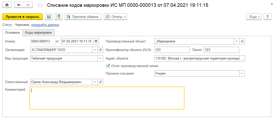 Списание кодов маркировки может производиться на основании отчета производственной линии. В этом случае в документе устанавливается флаг Отчет производственной линии. На закладке Основное указывается единая Причина списания для всех кодов по данному документу.