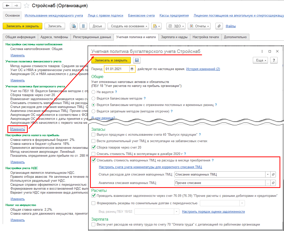 В блок Учетная политика бухгалтерского учета учетной политики организации добавлена опция Списывать стоимость малоценных ТМЦ на расходы в месяце приобретения.