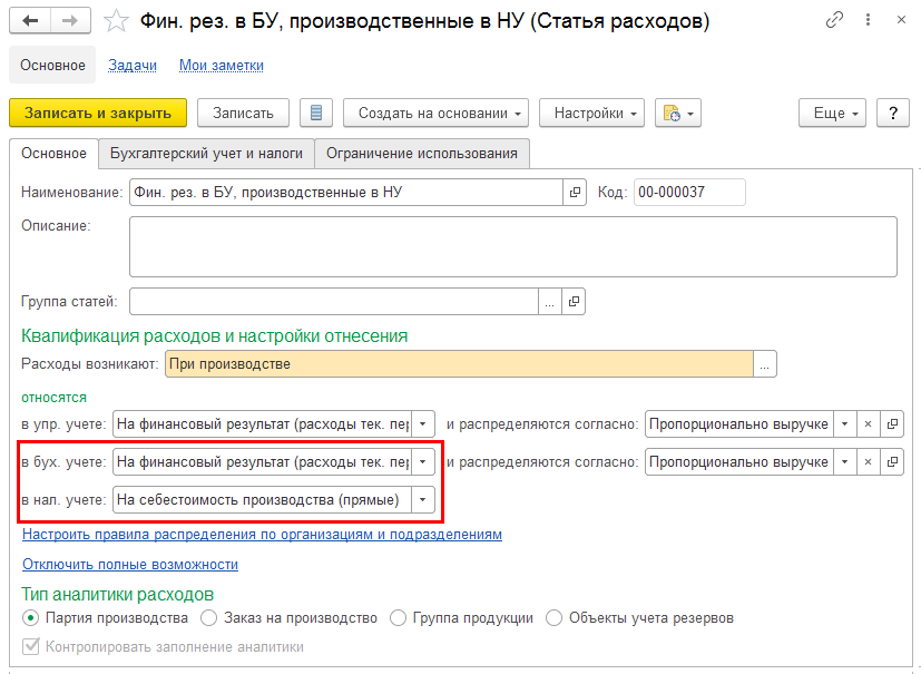 В карточки элементов списка Статьи расходов добавлены новые допустимые комбинации вариантов распределения в бухгалтерском и налоговом учете: