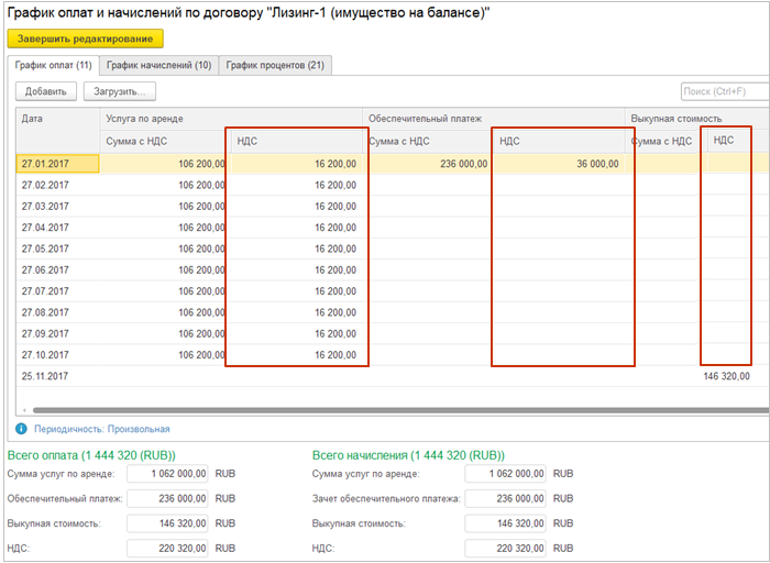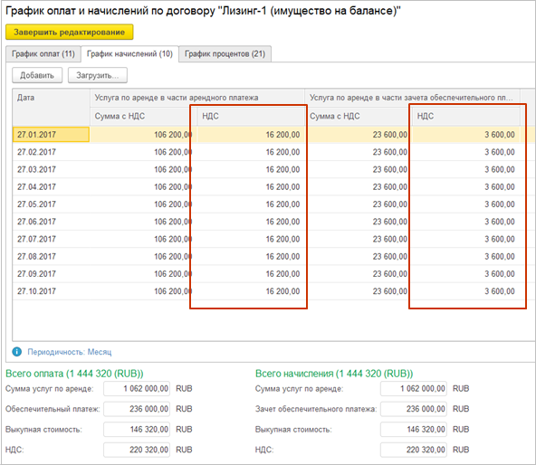 Если в документах Заключение договора аренды и Изменение условий договора аренды рассчитанная сумма НДС не совпадает с данными арендодателя, то в графике начислений и оплат нужно скорректировать суммы НДС (в системе добавлена такая возможность).