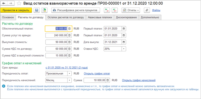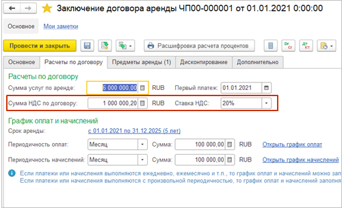 Для организаций, применяющих УСН, добавлена возможность при заполнении сумм расчетов по договору указывать суммы НДС, при этом НДС включается в стоимость арендованных основных средств.