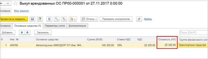 В документе Выкуп арендованных ОС необходимо указать стоимость в налоговом учете.