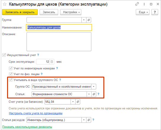 Для учета ТМЦ в виде группового ОС необходимо в Категории эксплуатации включить Учет в виде группового ОС.