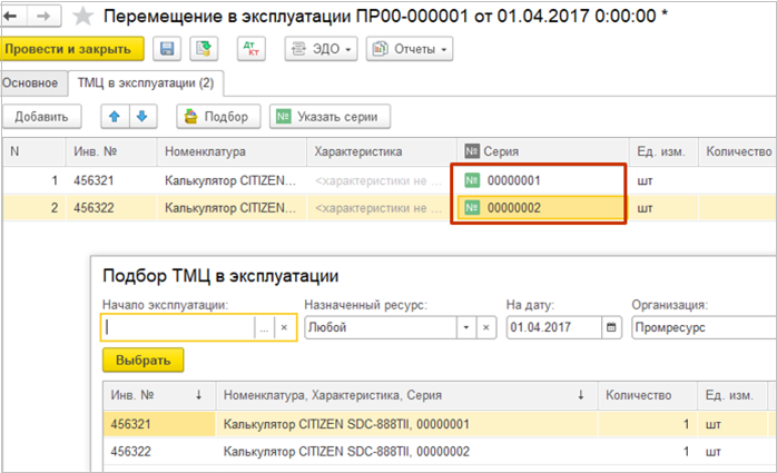 Серии указываются во всех документах учета ТМЦ в эксплуатации – передаче, перемещении, списании, возврате. Информация о серии хранится в остатках.