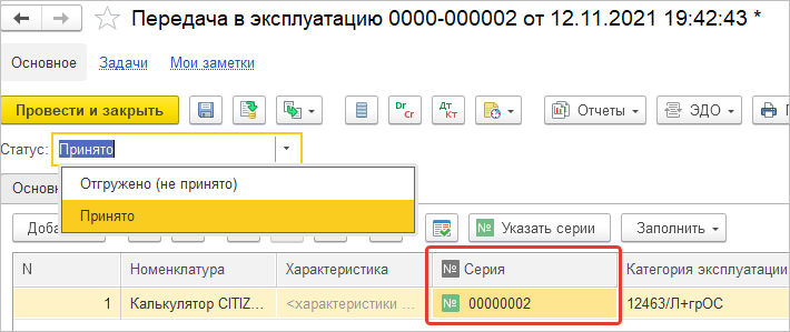 В случаях, когда серия присваивается ТМЦ при передаче в эксплуатацию (учет серий на складах для данного вида номенклатуры отключен, а для ТМЦ в эксплуатации – включен), для указания серии после отгрузки ТМЦ со склада можно использовать статус Отгружено (не принято) документа Передача ТМЦ в эксплуатацию (при данной комбинации серия не указывается).