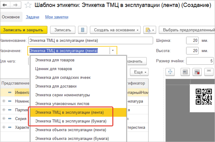 Для ТМЦ в эксплуатации можно создать свой шаблон этикетки и выбрать вариант печати «на ленте» или «на бумаге».