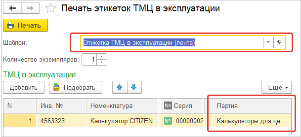 Для печати этикеток используется обработка Печать этикеток ТМЦ в эксплуатации. Для печати необходимо выбрать шаблон этикетки и партию ТМЦ.