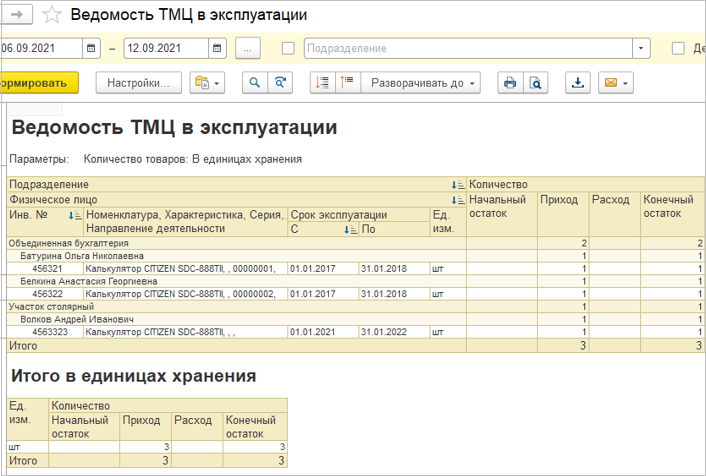 Если имущественный учет отключен, то ТМЦ в количественном выражении списываются при передаче в эксплуатацию и пользователю не требуется вести дальнейший учет (перемещение, списание, возврат).