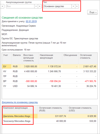 Тип ОС показывается в заголовке формы. По гиперссылке Узлы и компоненты амортизации можно посмотреть историю вхождения узла или компонента амортизации в состав ОС.