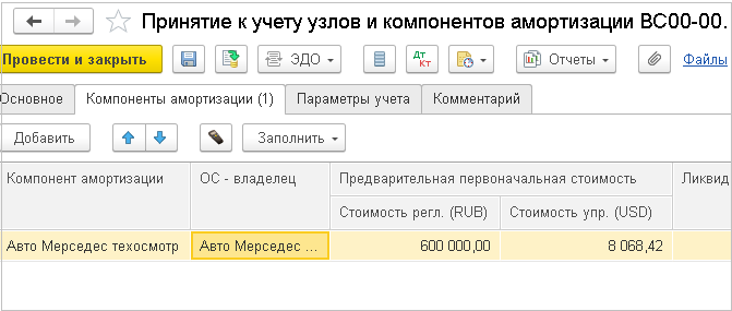Компоненты выделяются для особого порядка начисления амортизации, поэтому в документ добавлена возможность указать новые элементы амортизации в БУ и УУ, а также ГФУ.