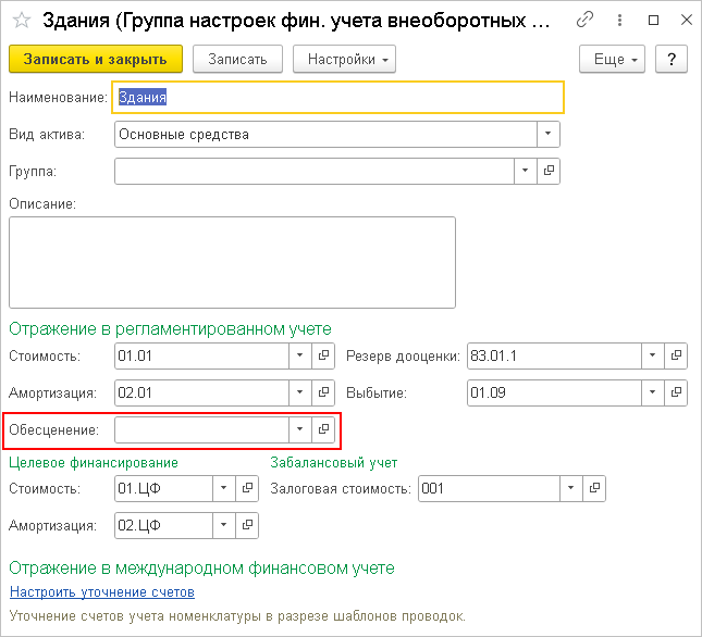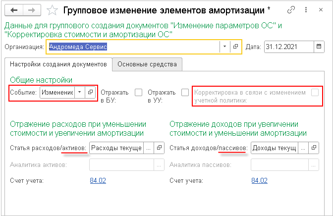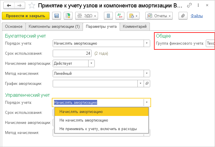 В документе можно указать отдельную ГФУ для определения счетов учета. Элементы амортизации настраиваются раздельно для БУ и УУ.