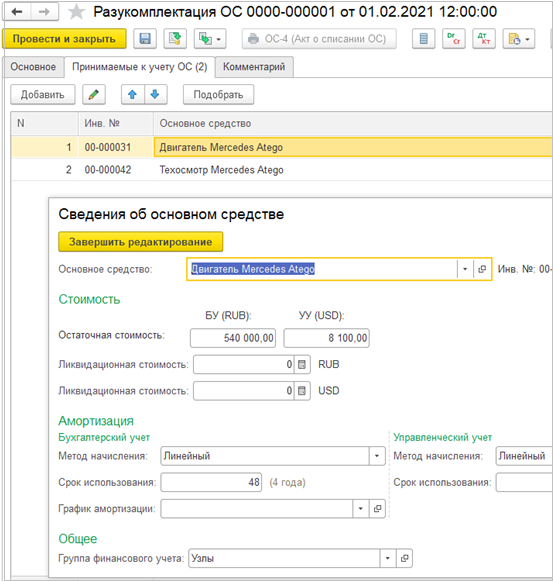 В документе Объединение ОС можно объединить несколько узлов и компонентов одного ОС-владельца. При объединении складываются первоначальная стоимость, накопленная амортизация, обесценение и ликвидационная стоимость.