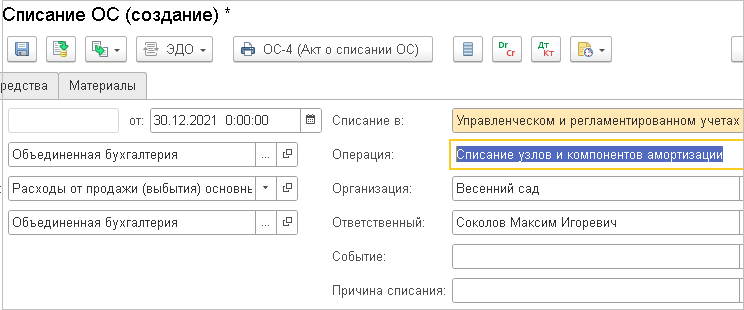 Следует учитывать, что не автоматизировано списание части стоимости компонента амортизации при выбытии одного из ТМЦ в эксплуатации.