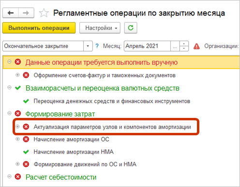 Изменение обесценения в операции закрытия месяца формирует задания на пересчет движений по ОС/НМА, расчет амортизации и расчет обесценения на следующий месяц.