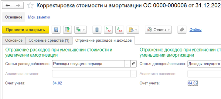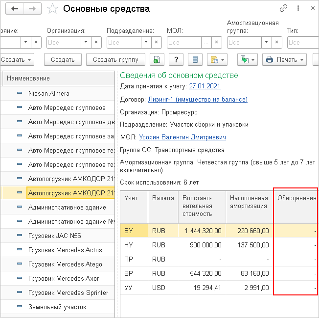 Сведения о сумме обесценения можно посмотреть в списках ОС и НМА, а также в карточках ОС и НМА.