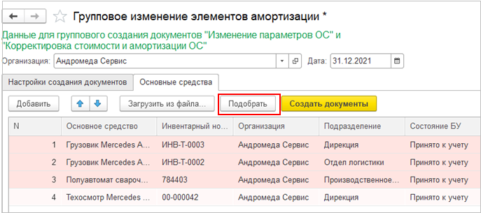 При присоединении/объединении все объекты, указанные в табличной части Основные средства, снимаются с учета. Поэтому при проведении для подчиненных узлов и компонентов амортизации меняется ОС-владелец без переноса стоимости и амортизации.