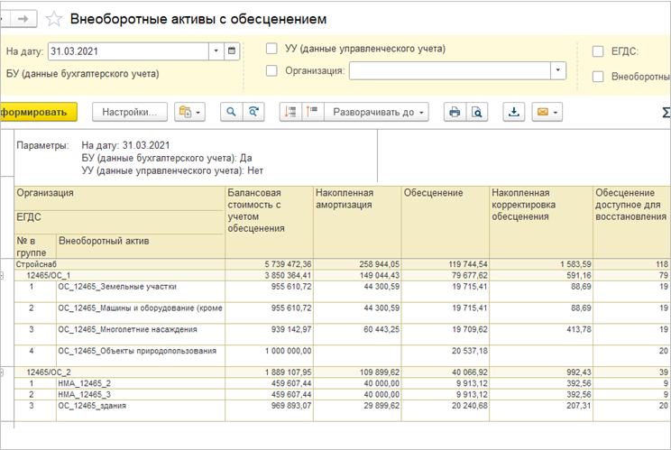 Корректировка обесценения рассчитывается в общем алгоритме с амортизацией ОС/НМА. При этом расчет производится отдельно для БУ и УУ, а остатки по обесценению берутся на начало месяца.