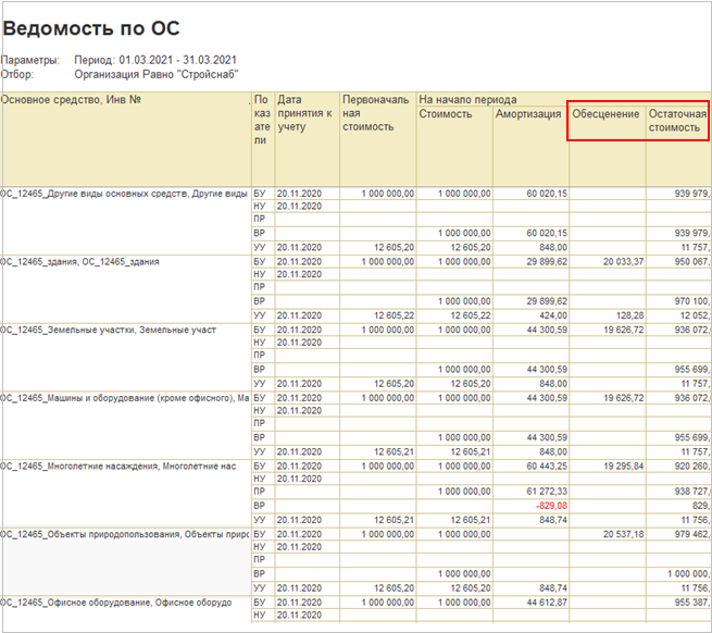 В отчете Ведомость по ОС выведена колонка с обесценением, и остаточная стоимость на начало и конец периода показывается с учетом обесценения.
