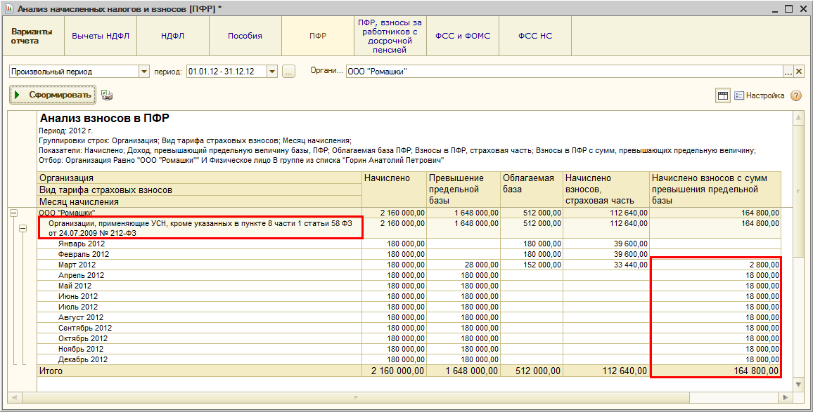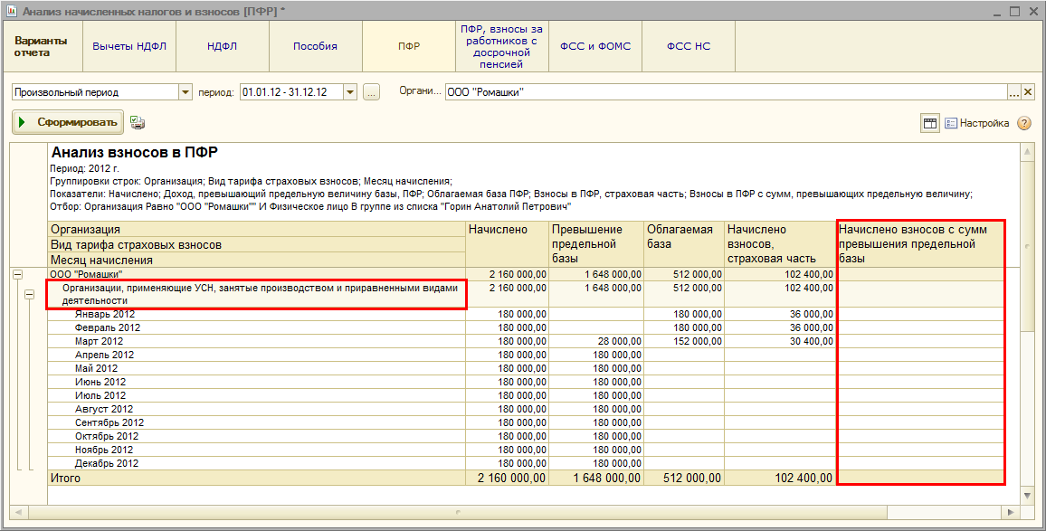 Например, предположим, что организация применяет УСН, но не занимается "льготной" деятельностью, т.е. использует "основной" тариф страховых взносов. В 2012 году сотруднику ежемесячно начислялось 180 000 руб., при достижении в марте (нарастающим итогом с начала года) начислениями предельной величины базы для начисления взносов 512 000 руб. по этому сотруднику взносы с сумм превышения рассчитываются по тарифу 10%.