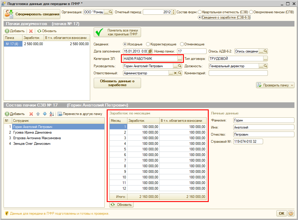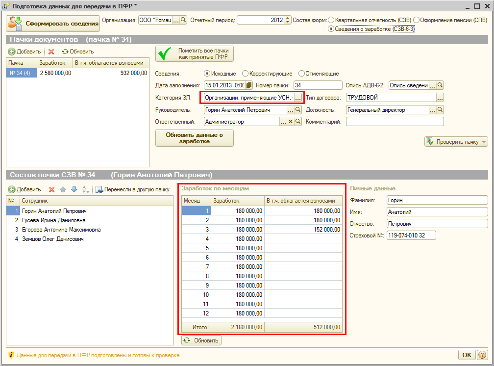 В версии 2.5.60 при автоматическом заполнении данных для формы СЗВ-6-3 в колонку "Из них на которые начислены страховые взносы на обязательное пенсионное страхование" попадают, в том числе, суммы, превысившие предельную величину базы для начисления взносов.