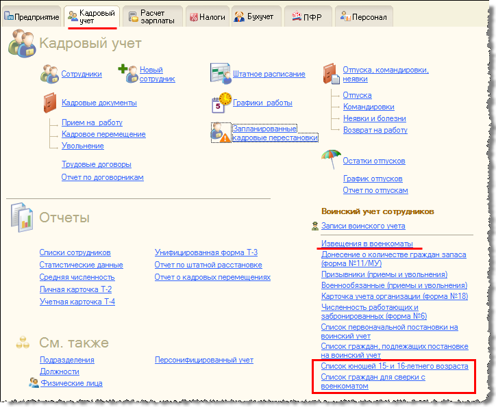 В версии 2.5.67 форма "Извещение в военкомат" приведена в соответствие с приложением № 9 к "Методическим рекомендациям по ведению воинского учета в организациях" (утв. Генштабом Вооруженных Сил РФ). Реализованы новые формы "Список юношей 15- и 16-летнего возраста" и "Список граждан для сверки с военкоматом" в соответствии с приложениями № 11 и № 12 к рекомендациям. Отчеты доступны по ссылкам на рабочем столе или из главного меню.