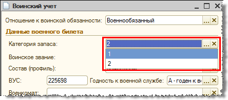 Обращаем внимание, что до версии 2.5.67 категория запаса (которая показывается, например, в карточке Т-2 и в отчетности в военкоматы) выбиралась из перечня: