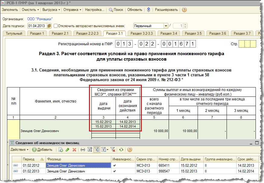 В версии 2.5.64 была реализована новая форма РСВ-1, подраздел 3.1 которой предусматривает указание сведений о нескольких справках об инвалидности одного лица, однако автоматически в отчет выводилась только одна, последняя действующая справка. В версии 2.5.67 реализовано заполнение сведение о двух справках, поскольку справка выдается как минимум на один год.