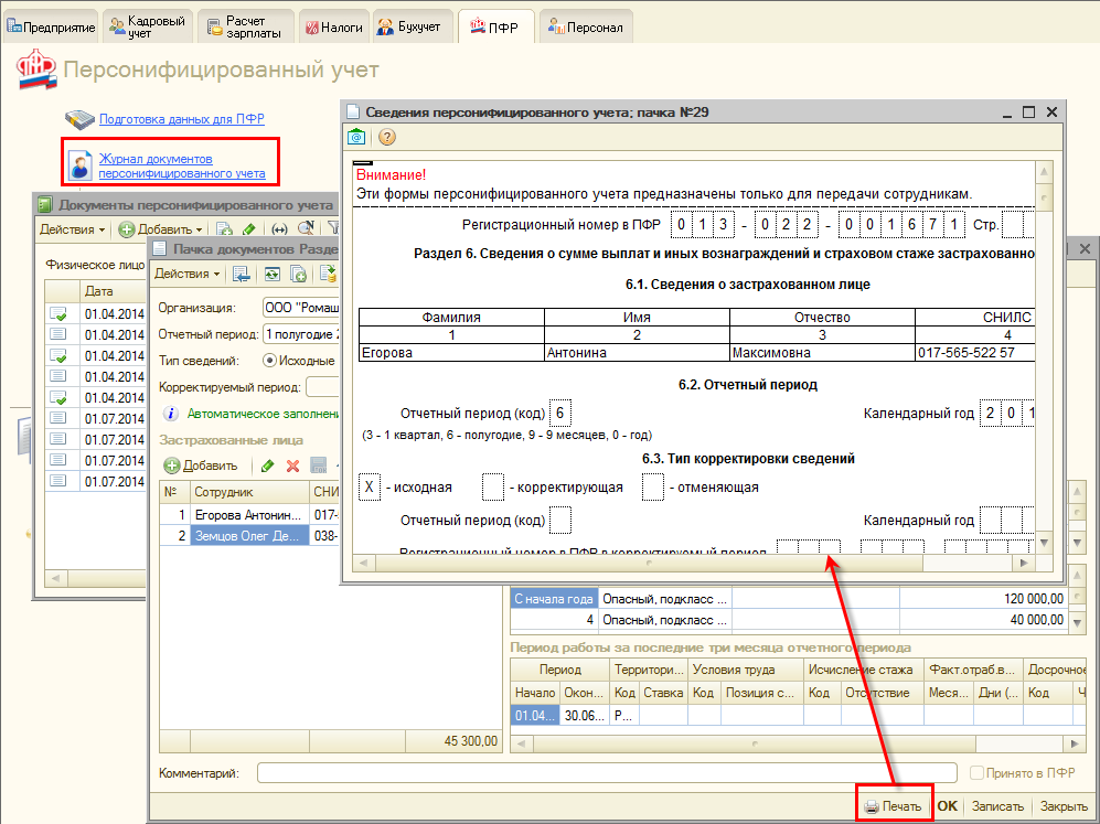 Для поддержки возможности быстрой и беспроблемной печати сведений в таких случаях в документах «Пачка документов Раздела 6 Расчета РСВ-1» реализована возможность получения печатных форм для выдачи сотрудникам. Согласно порядку формирования отчетности, в одну пачку могут входить сведения не более чем о 200 застрахованных лицах, поэтому печать такого относительно небольшого объема сведений, как правило, не вызывает трудностей.