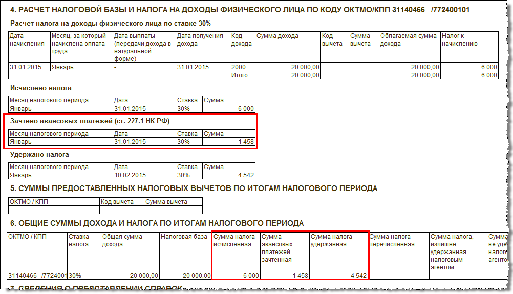Удержание налога будет произведено за вычетом зачтенной суммы. В примере к выплате полагается 20 000 - (6 000 - 1 458) = 15 458 руб.