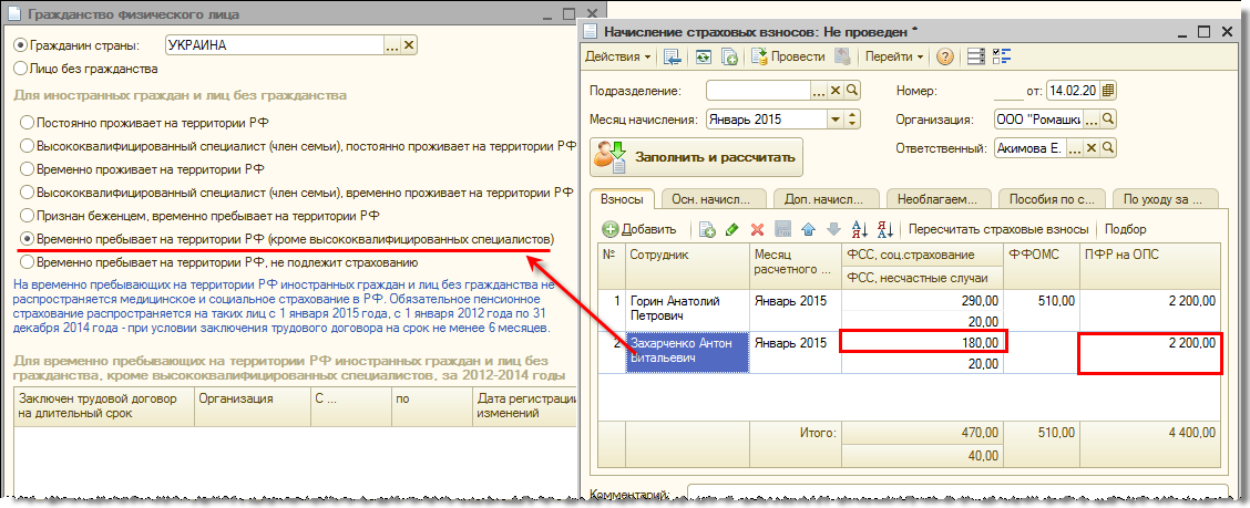 Подробно эти вопросы были рассмотрены в материалах "Расчет страховых взносов за временно пребывающих иностранных граждан с 2013 года" и "Новое в версии 2.5.57".