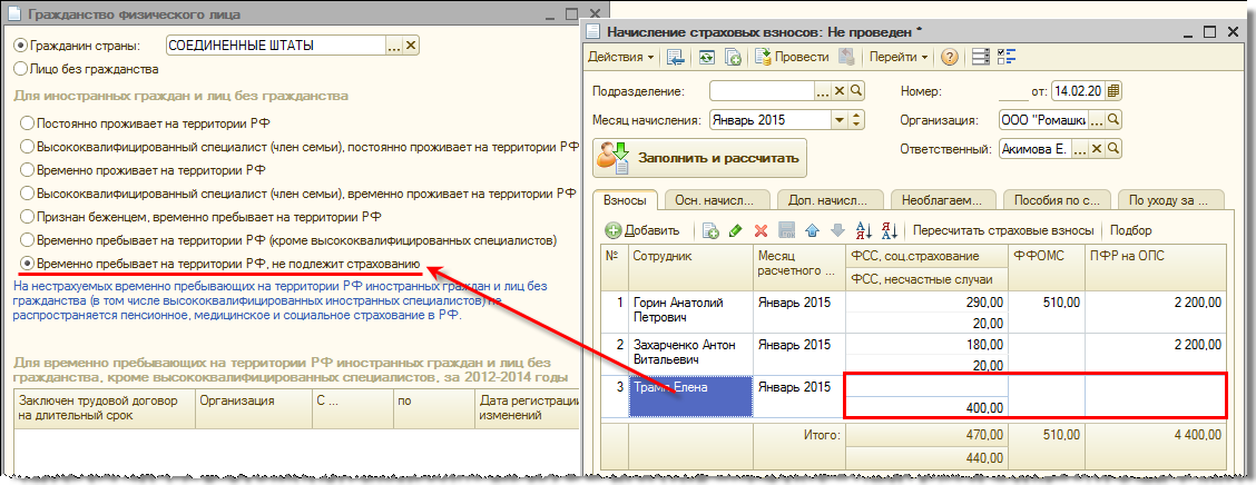 До версии 2.5.87 для временно пребывающих высококвалифицированных иностранных специалистов предполагалось указывать статус «Временно пребывает», и при этом не указывать сведения о заключенном трудовом договоре. В этом случае взносы во все фонды (кроме взносов в ФСС на страхование от несчастных случаев и производственных заболеваний) не начислялись.