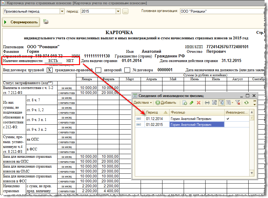 Поскольку срок действия пониженных тарифов для организации инвалидов (также для отдельных сотрудников-инвалидов) завершен с 2015 года, данные о доходах инвалидов на отдельную страницу карточки не выводятся. При этом при наличии инвалидности в течение года, она отмечается в шапке карточки.