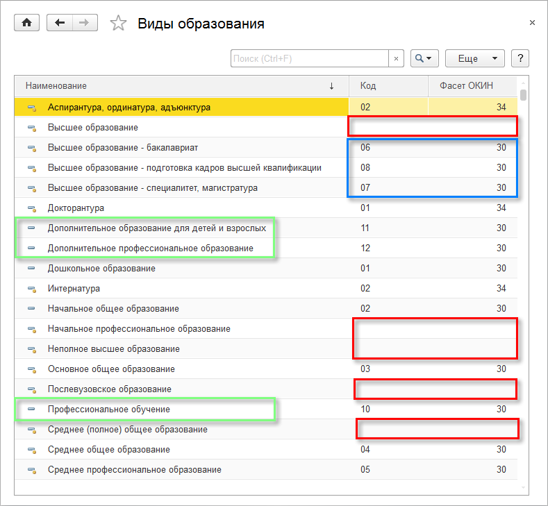 На рисунке зеленым отмечены добавленные виды образования, синим – с уточненным кодом, красным – упраздненные.