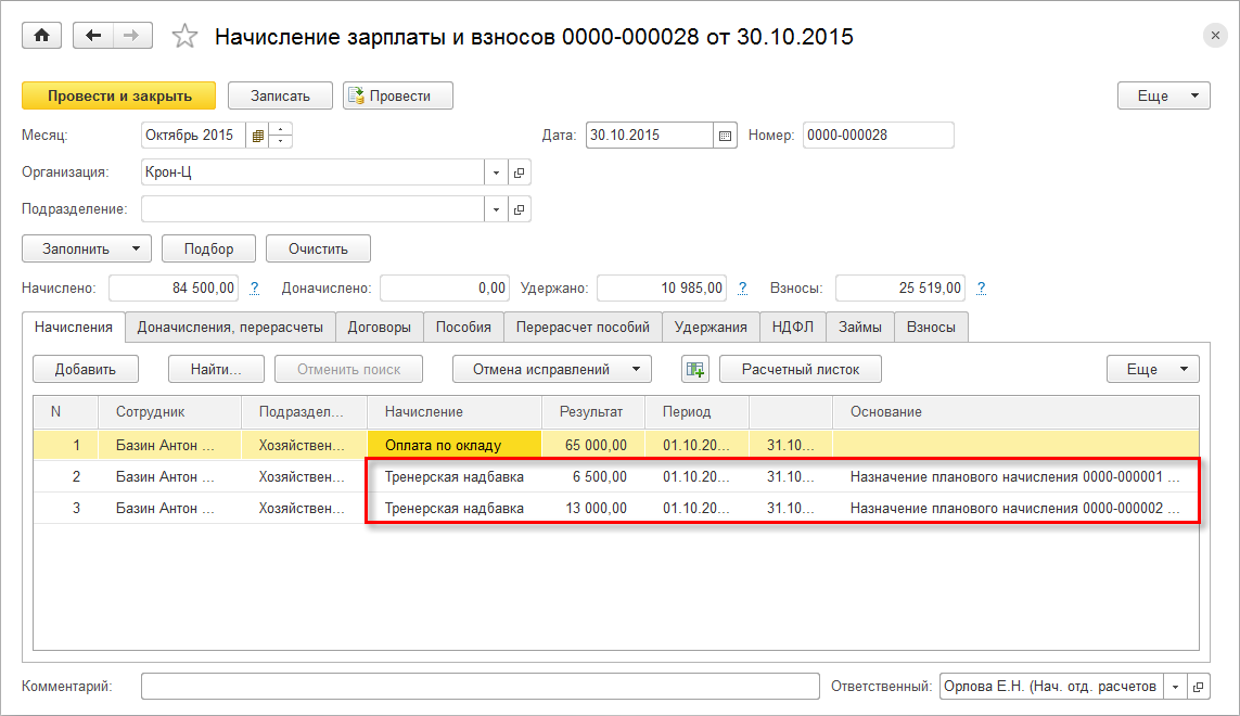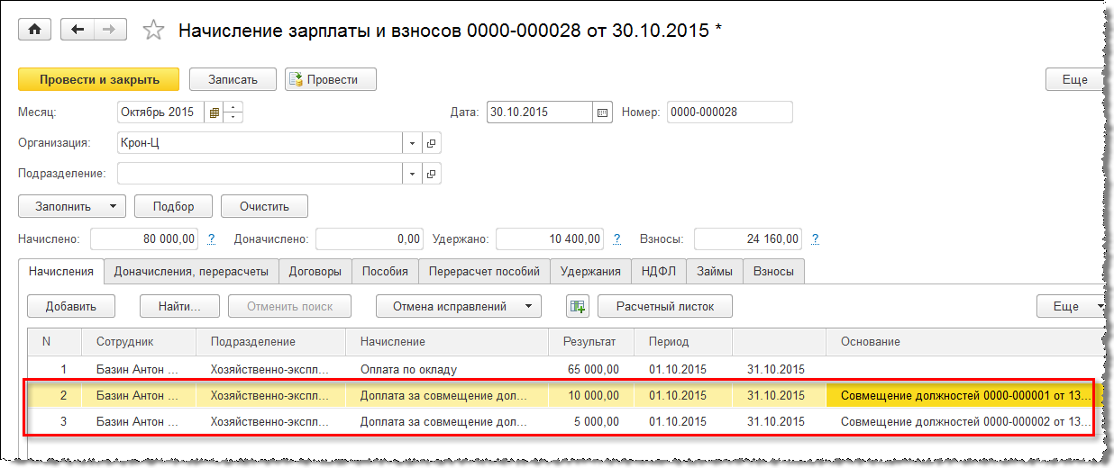 Теперь этому сотруднику одновременно будет начисляться два одинаковых начисления, но по разным основаниям.