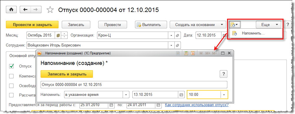 В указанное время (которое можно гибко настраивать, в том числе относительно дат, имеющихся в самом документе) автоматически откроется окно с напоминанием. Напоминание можно прекратить или отложить.