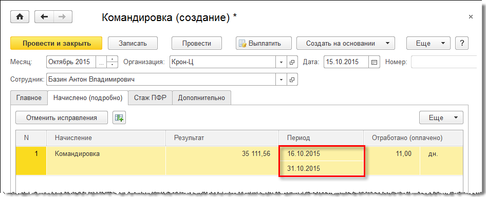 Например, если командировка начинается 16.10.2015 и заканчивается 20.11.2015, то в этом случае в самом документе будет начислена оплата только за октябрь.