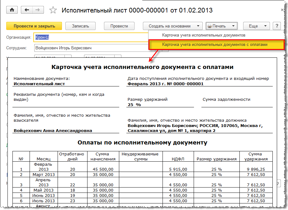 В документ «Исполнительный лист» также добавлена новая печатная форма – карточка учета исполнительных документов с оплатами. В отличие от обычной карточки учета, в ней помимо параметров исполнительно листа приведена еще и история расчетов по нему.