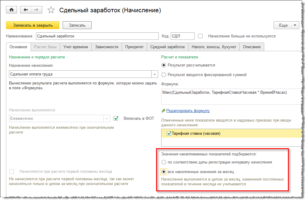 В связи с этим для начисления, в формуле которого используется накапливаемые показатели (в частности, «Сдельный заработок»), реализована возможность указать, как следует заполнять значения накапливаемых показателей при его расчете.