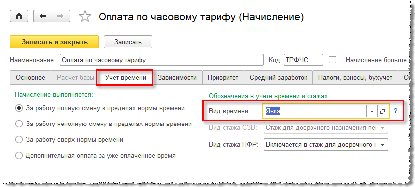 Для снятия этих ограничений в версии 3.0.24 реализована возможность для начисления указывать несколько видов времени, по которым при его расчете будет определяться отработанное время (с использованием показателей ВремяВЧасах или ВремяВДнях).
