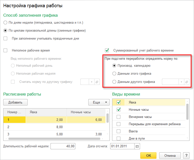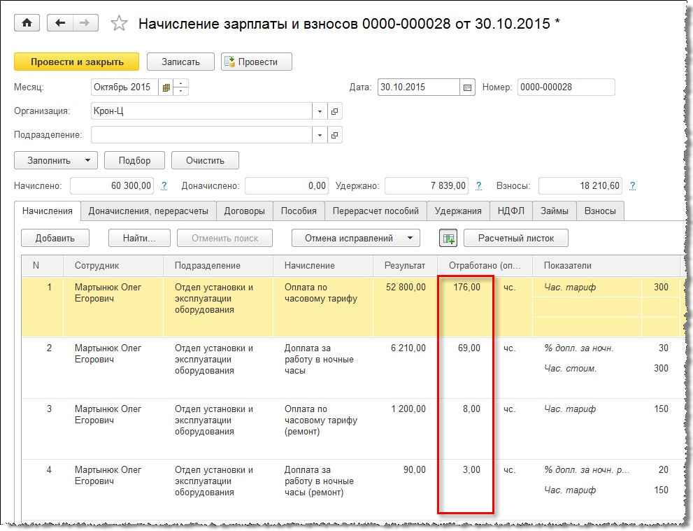 При этом если для расчета начисления требовалось учитывать несколько видов времени, то была возможность учитывать только все их сразу с помощью показателя ОтработаноЧасовВПределахНормыВремени. Например, для расчета оплаты по часовому тарифу требуется учитывать не только часы явки (работу в дневное время), но и ночные часы.