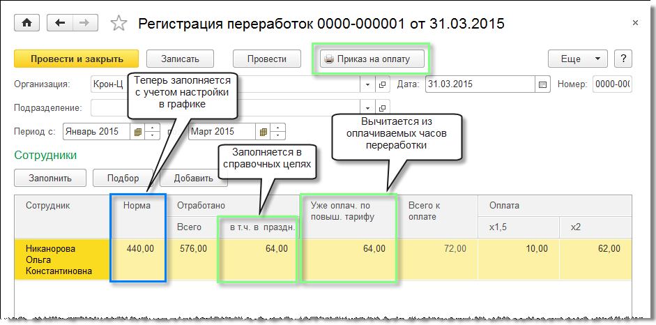 Например, в рассматриваемом примере второй сотрудник был принят на работу 10.10.2015, а вся сумма сдельной выработки будет зарегистрирована сводно на 01.10.2015.