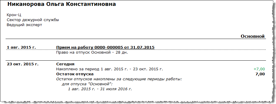 По пожеланиям пользователей в версии 3.0.24 поведение программы изменено. Теперь если сотрудник с краткосрочным трудовым договором не был уволен, остатки его отпусков автоматически исчисляются исходя из «стандартного» права на отпуск в календарных дня. А к последующему месяцу добавляются «компенсационные» остатки за два предыдущих (условно говоря, за этот месяц полагается 3 дня вместо 2,33).